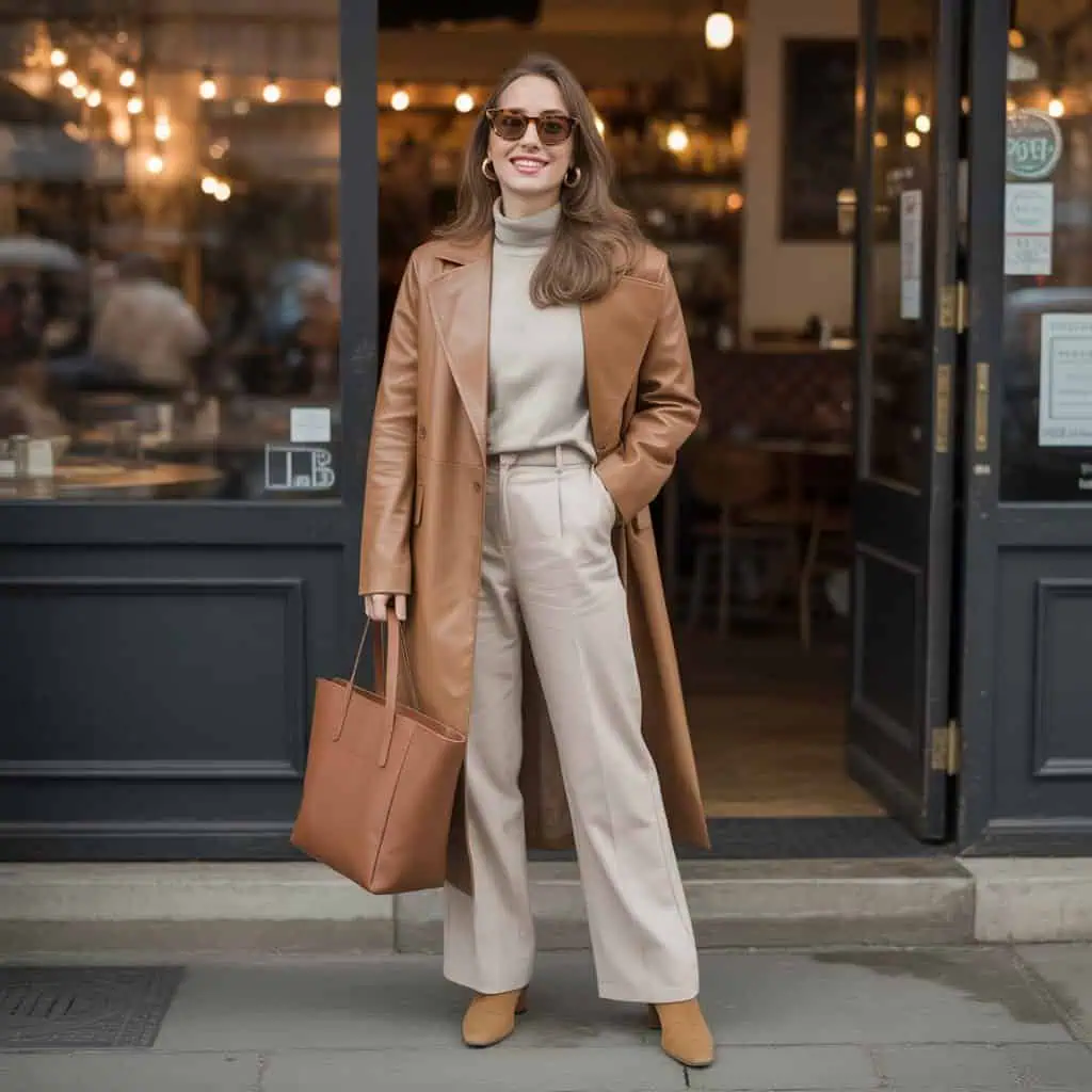 Embrace the edgy allure of a long leather coat by pairing it with wide-leg trousers for a striking silhouette that’s both modern and chic. The contrast of the structured coat against the flowing nature of wide-leg trousers creates a fascinating play of proportions. Go for crisp white underneath to accentuate that upscale vibe, while black pointed-toe ankle boots ground the look with elegance. Statement earrings and a structured handbag add flair without overwhelming the aesthetic. This outfit strikes the perfect balance between bold and refined, ideal for making a powerful impression during busy city outings or cozy coffee breaks.