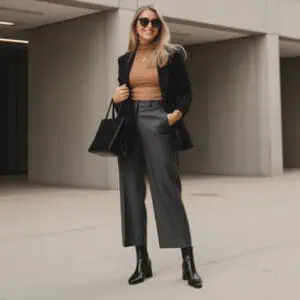 By opting for an all-black look, you’re embracing a style that’s both chic and undeniably striking. Monochrome outfits elongate the frame, often providing a sleek and sophisticated appearance. A relaxed-fit turtleneck tucked into wide-leg trousers offers both comfort and a tailored aesthetic, allowing you to feel at ease without sacrificing style. Delicate accessories, such as gold hoop earrings, introduce a hint of warmth, while the quilted shoulder bag adds an element of texture. This look is fantastic for showcasing confidence and sophistication, making it a go-to for a night out or an upscale brunch.