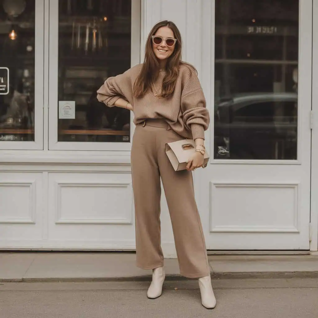 Opting for a camel knit set paired with cream boots radiates coziness while maintaining a chic edge. The knit fabric not only ensures comfort but also adds texture to your ensemble, making it visually appealing. This tonal approach of matching the sweater with high-waisted trousers creates a harmonious look, emphasizing that tonal dressing is definitely a key trend for a high-end appearance. The cream boots provide a crisp contrast that elevates the simplicity of the knit ensemble. When topped with oversized sunglasses and a matching handbag, the entire outfit offers a fresh, modern look. This is perfect for those laid-back yet polished occasions where style and comfort coexist effortlessly.
