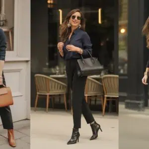 Transforming a spaghetti strap dress into a sophisticated office-ready outfit is all about the right layering. A sleek black spaghetti strap dress under a tailored white blazer adds polish and structure, creating a gorgeous contrast that empowers your look. Whether you’re heading to a meeting or a dinner date, this combination strikes a lovely balance between professional and feminine. The black pointed-toe pumps elongate the legs while maintaining comfort, and the addition of gold jewelry provides just the right touch of luxe. By incorporating oversized sunglasses, you finish the ensemble with an air of confident sophistication that is undeniably chic for your 40s.