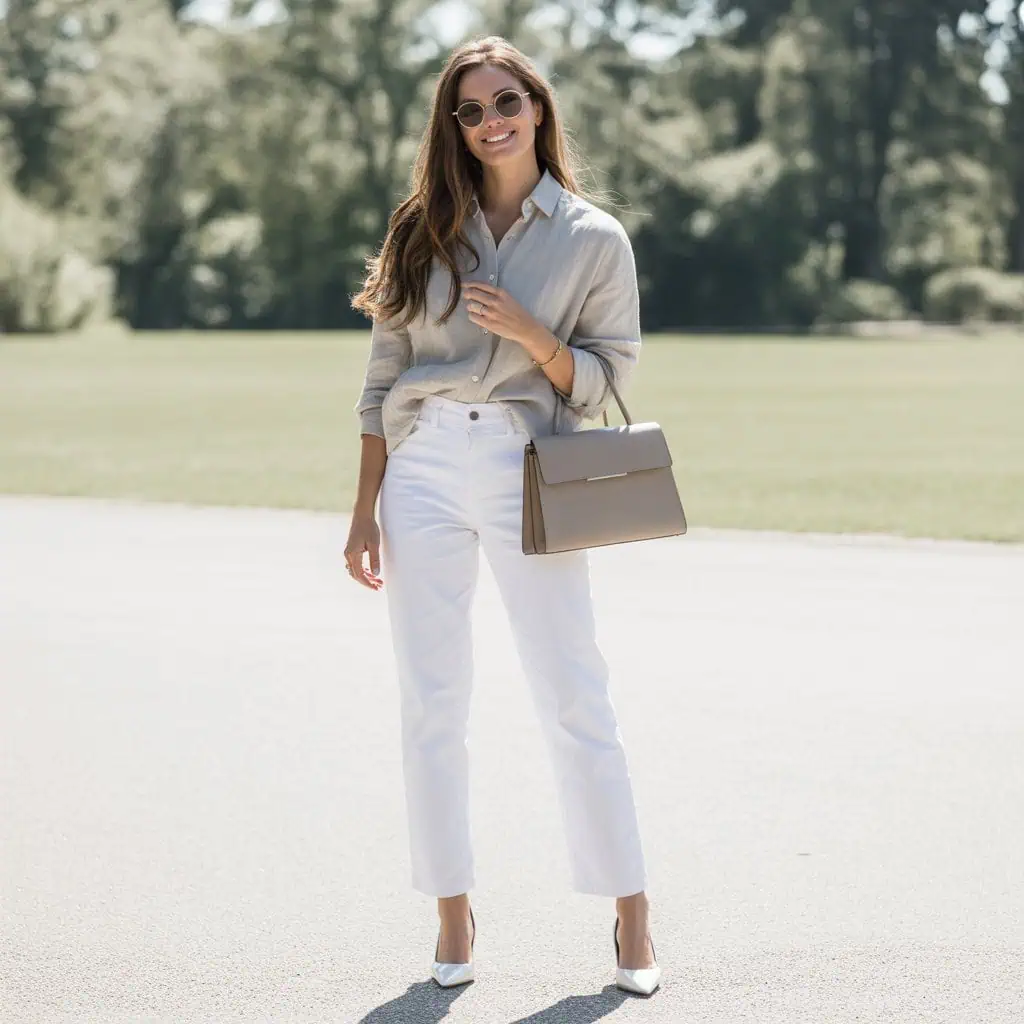 Opting for a relaxed linen shirt paired with white jeans is a smart choice for achieving a laid-back yet stylish outfit. The linen fabric breathes beautifully, making it ideal for warm days while the crisp white jeans offer a fresh contrast. Tucking in the shirt not only defines the waist, but also crafts a more put-together appearance that seamlessly blends comfort and style. Chic white heels add a playful touch, perfect for transitioning from day to evening. Accessorizing with modern sunglasses and a structured neutral handbag completes the look, striking the right balance between casual and refined.