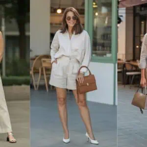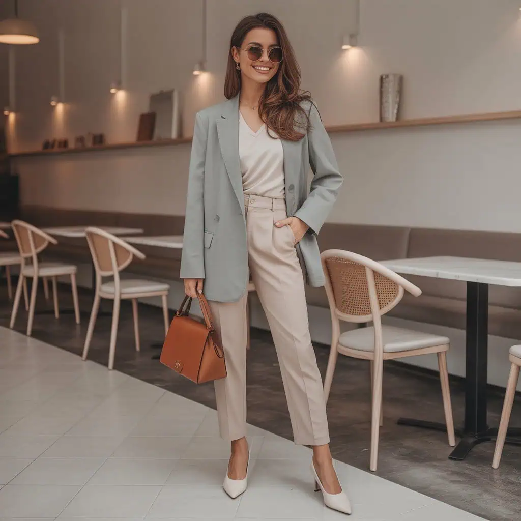 The dreamy combination of pale blue and white screams fresh, clean style—ideal for a daytime outing. Pale blue is soothing and uplifting, creating a lovely contrast with the crispness of white. An oversized blazer layered over a fitted top offers a modern yet relaxed silhouette, while high-waisted trousers exude a professional, refined edge. White pointed-toe slingback heels bring a touch of femininity that’s both chic and practical. By rounding off the look with oversized sunglasses and a soft beige handbag, you not only amplify the sophistication but also demonstrate an effortless understanding of luxe minimalism.