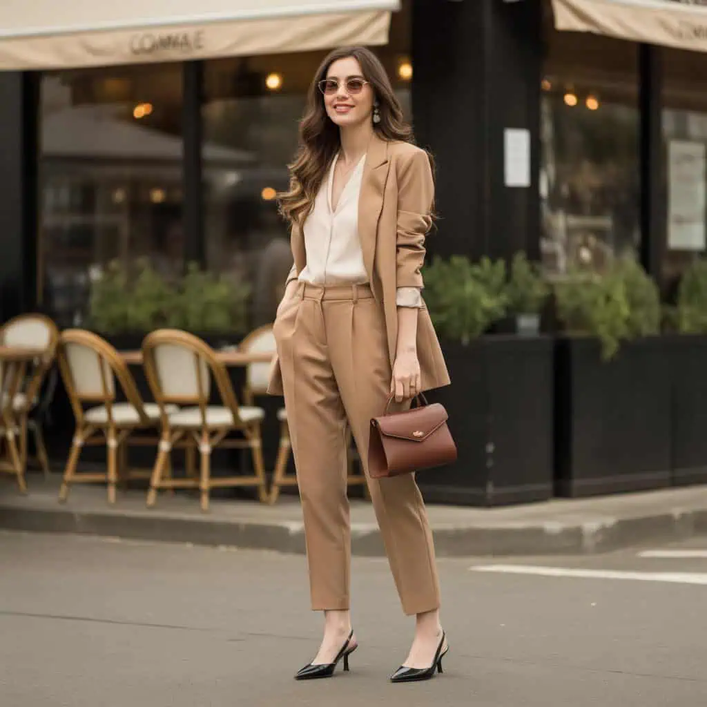 Pairing ivory with camel creates an immediately polished look that exudes confidence and sophistication. The richness of camel balances beautifully against a soft ivory base, making the entire outfit appear well thought-out without being overly flashy. A slight texture contrast, like an ivory shirt topped with a tailored camel blazer, adds depth and interest. The outfit defines your silhouette, while heels provide a perfect blend of comfort and style. Accessorizing with stylish sunglasses and a chocolate brown bag introduces an element of luxury, ensuring you turn heads wherever you go.