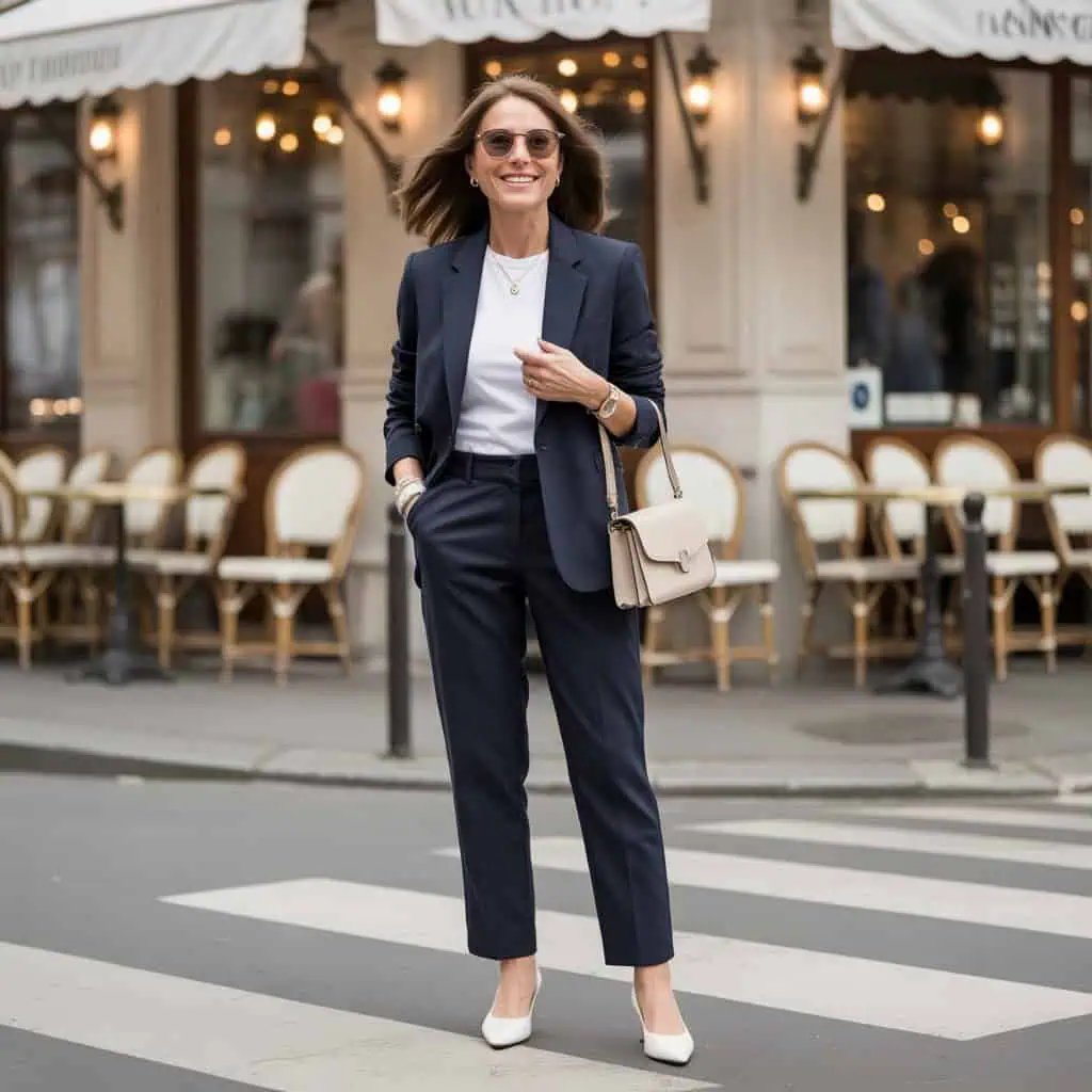 Clean silhouettes can work wonders for conveying a sharp, sophisticated appearance. Tailored pieces like a navy blazer and crisp white blouse create a streamlined look that complements the form without overwhelming it. This thoughtful pairing not only highlights the body’s natural shape but also imbues the outfit with an aura of professionalism and grace. The classic heels add a touch of timelessness while maintaining comfort. With oversized sunglasses and a structured leather handbag, the entire ensemble remains stylish and polished—perfect for a day out or a cultural event. A clean silhouette allows every piece to shine, unifying the outfit in simplicity.