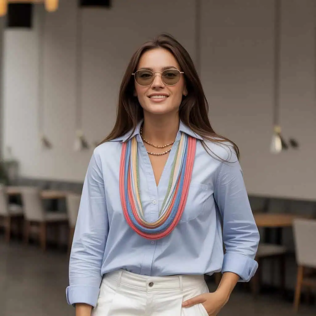 Bulky scarf necklaces may seem enticing for their ability to add color and texture to an outfit, but they can also become cumbersome if not balanced correctly. Paired with a classic blue V-neck shirt, the scarf necklace enriches your look without detracting from your neck’s elegance. The V-neck subtly elongates your neckline, giving you a longer silhouette that works wonders against the weight of the necklace. Tucking the shirt into white wide-leg pants allows for a chic, effortless vibe, ensuring you breathe easy while carrying the statement piece. Emphasize comfort while keeping the focus on that radiant smile, which is the ultimate accessory in any outfit!