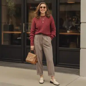 When it comes to creating a stylish, minimalist wardrobe, a few well-chosen seasonal accents can make all the difference. This outfit makes a strong case for simplicity by pairing a classic white T-shirt with cropped olive-green trousers. The lightweight camel-colored scarf adds just the right touch of warmth and color, capturing the essence of the season without overwhelming the look. The beige leather ballet flats are chic yet practical, making them the perfect choice for various occasions. Complemented by oversized tortoiseshell sunglasses and gold hoop earrings, the look is sophisticated but effortlessly approachable. This ensemble serves as a reminder that intentional style doesn’t require excess; instead, it celebrates the beauty of thoughtful details that express individuality while remaining chic.