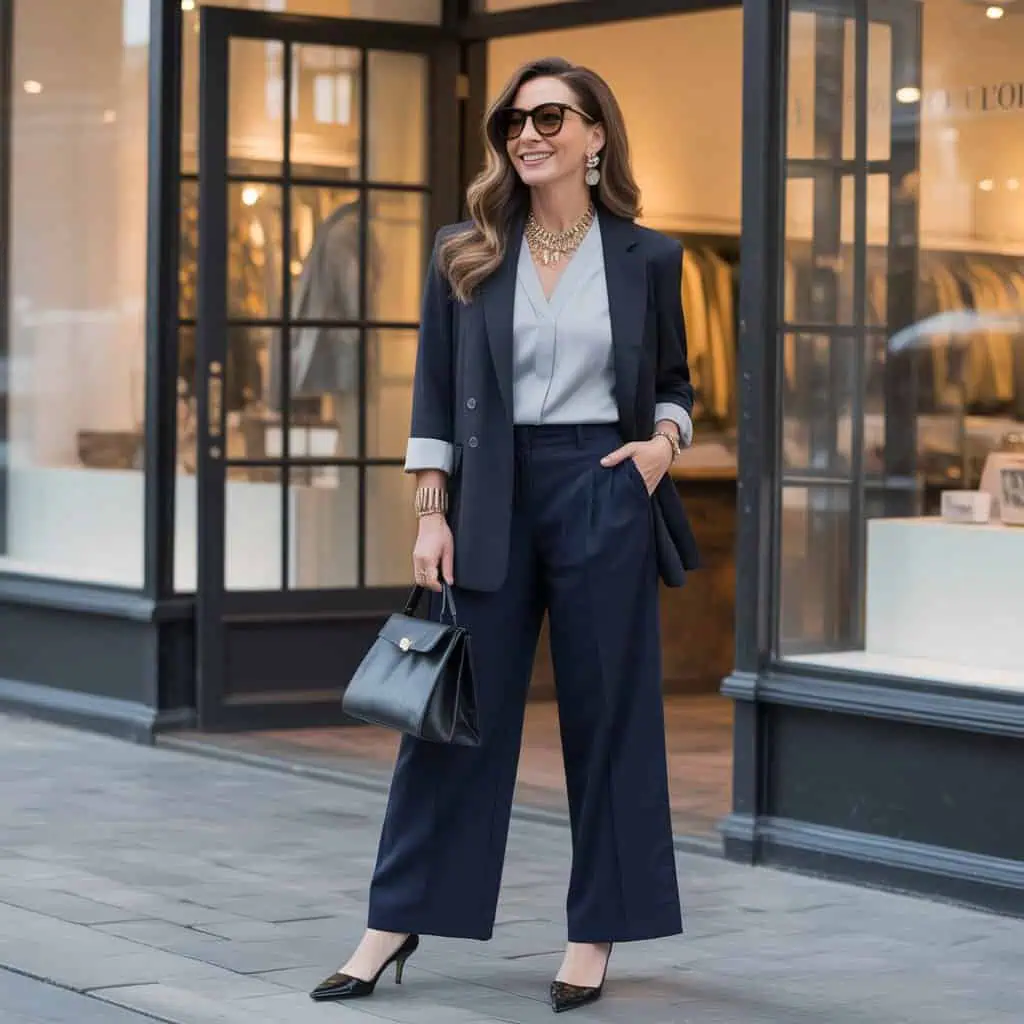 Embracing the less-but-better wardrobe rule means opting for timeless elegance rather than fleeting trends. This outfit beautifully embodies that philosophy, merging comfort with sophistication. The tailored wide-leg trousers serve as a versatile base, effortlessly transitioning from day to night. Paired with a fitted top, this combination flatters the figure while ensuring a polished look. The addition of heels brings in a modern yet relaxed vibe, offering a playful contrast to the sleek silhouette. Accessories like oversized black sunglasses and delicate gold jewelry elevate the ensemble, showcasing an understanding of balanced styling without feeling overdone. This look not only highlights personal style but also prioritizes quality over quantity, making it ideal for the confident woman who values enduring fashion choices.
