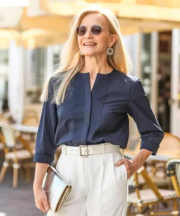 There’s something undeniably cozy about a neutral knit that makes it a go-to for any season. Tucked into tailored taupe trousers, it creates a polished silhouette that feels effortlessly chic. The warm tones of the knit complement the trousers beautifully, making the entire ensemble look thoughtfully curated. Pairing cognac leather ankle boots with a block heel not only elevates your height but also adds a touch of interest to the outfit. Delicate gold jewelry peeks through the fabric, introducing a subtle shine that enhances the overall look without overshadowing the softness of the knit. This combination is perfect for maintaining comfort while looking effortlessly stylish, making it a staple for your wardrobe.
