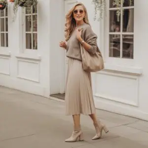 A cozy sweater dress is the ultimate low-effort piece that lends itself well to a multitude of settings, from casual outings to more polished gatherings. The cinched waist adds definition, creating a flattering silhouette that enhances natural curves. Taupe heeled loafers not only ensure comfort but also introduce a dash of sophistication, making it easy to transition from day to evening. Carrying a matching handbag and donning simple gold hoop earrings completes the ensemble without overwhelming it. This outfit embodies warmth and style, proving that feeling good can be wonderfully chic.