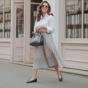 Opting for a flowy midi skirt gives your outfit a graceful flair that pairs beautifully with minimal white leather sneakers. The skirt’s movement conveys femininity while the turtleneck keeps things sleek and sophisticated. By tucking in the top, you create an accentuated waist that enhances your figure, comfortably straddling the line between casual and professional. The choice of accessories, like tortoiseshell sunglasses, brings a chic retro vibe without overwhelming the outfit. This look embodies versatility, allowing you to navigate any office environment with ease and flair while still feeling grounded in comfort.
