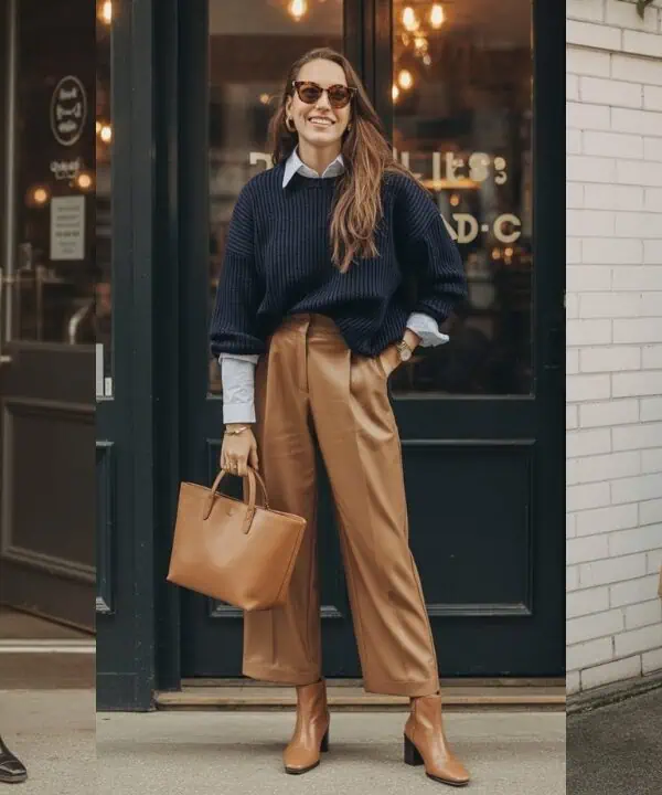 This combination works because it blends structure with softness. Tailored trousers provide shape, support, and polish, while a knit top adds comfort and flexibility. Women rely on this pairing because it adapts easily to different environments. The trousers ground the outfit, making it feel intentional, while the knit prevents it from becoming stiff or formal. Fine gauge sweaters, lightweight knits, or soft cotton blends work especially well.