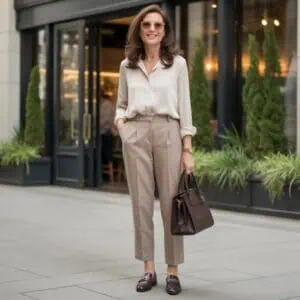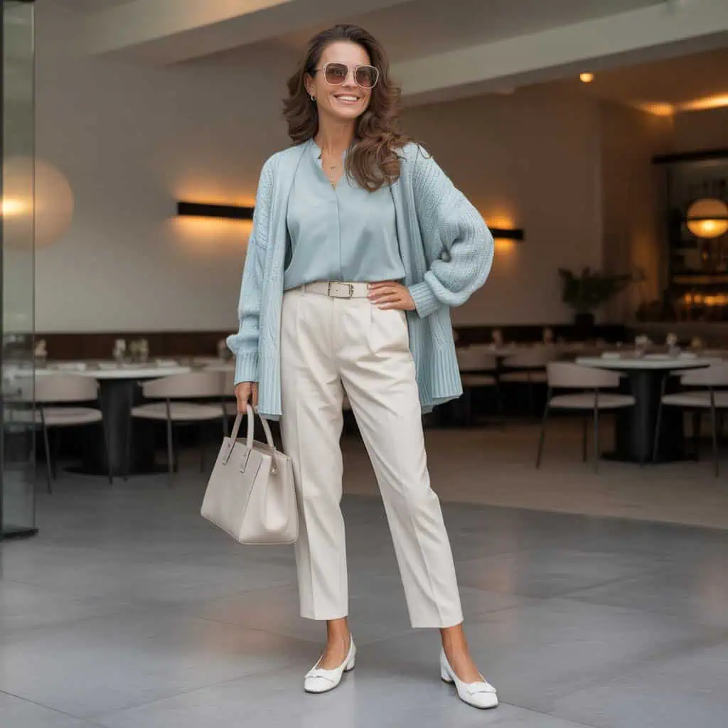 Creating a harmonious look is all about the colors you choose. Soft pastel hues are universally flattering and evoke a sense of calm and confidence. A pastel blue blouse tucked into cream tailored trousers creates a gentle contrast that flatters all skin tones, while providing a polished, put-together appearance. Layering with a matching lightweight cardigan enhances the cohesiveness of the outfit, making it versatile for transitional weather. White leather ballet flats keep everything fresh and clean while offering comfort for all-day wear. Accessorize with oversized sunglasses and a structured beige handbag for that perfect finishing touch, exuding a refined taste that makes any woman feel effortlessly chic, regardless of age.