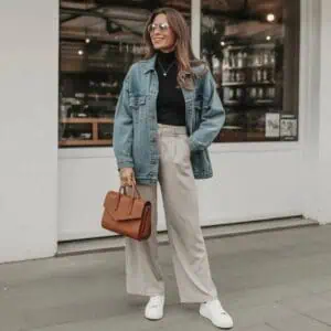 Opting for soft pleated ankle pants introduces a touch of sophistication and whimsy to your wardrobe. These pants create graceful movement as you walk, and their tailored look complements a variety of tops beautifully. Layering a structured blazer over a simple black top elevates the outfit while maintaining an air of relaxed elegance. Cream ballet flats provide a classic yet comfortable footwear choice, ensuring you can transition effortlessly between day and evening. The addition of elegant sunglasses and a structured beige handbag emphasizes the outfit’s chic factor, making it perfect for gallery openings or lunch dates with friends.
