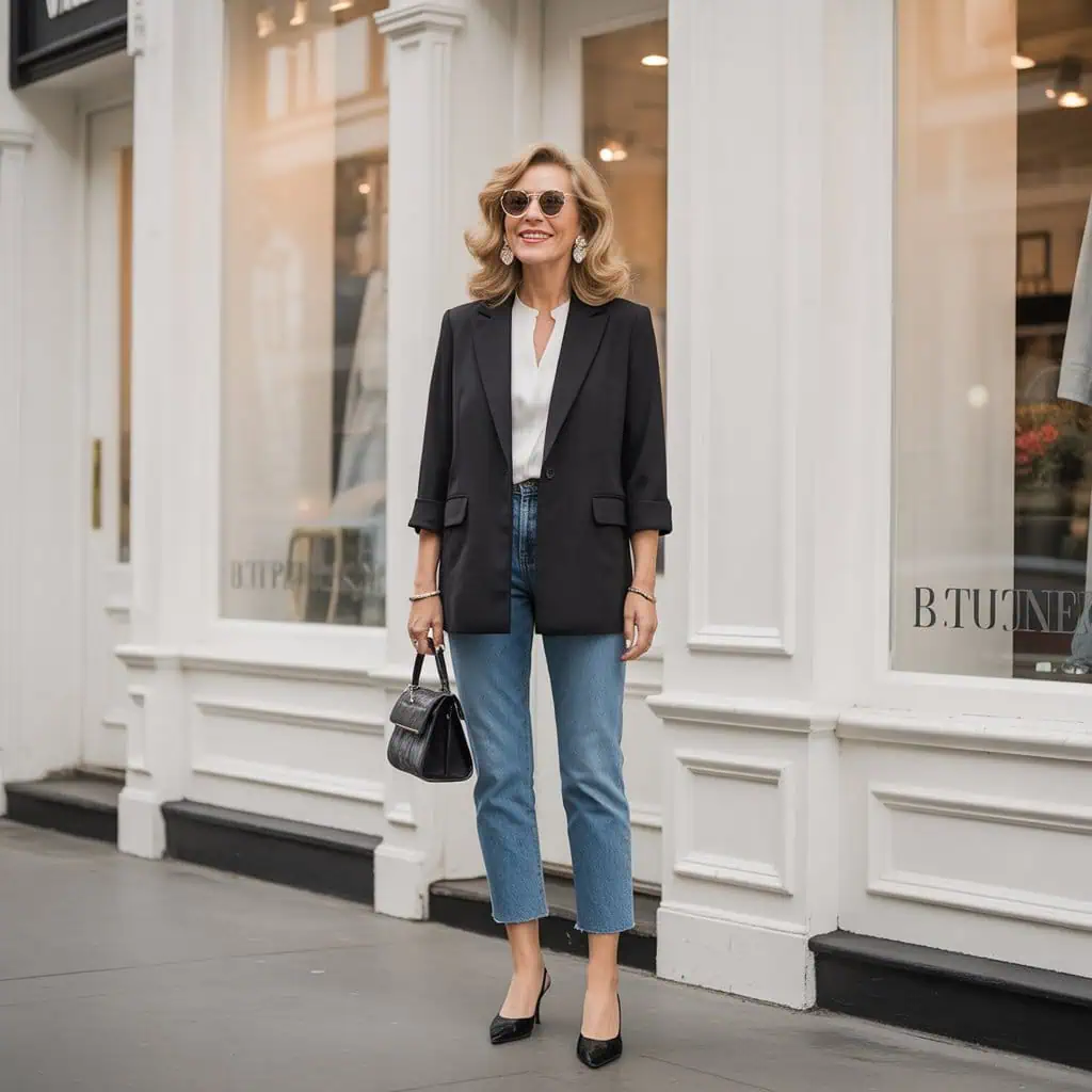 Opting for a jacket with tapered sleeves that finish at the wrist is a flattering way to showcase your accessories and add refinement to your look. This design choice creates an illusion of longer arms, drawing attention to the wrists, which tend to be a youthful feature. Paired with straight-leg jeans and a fitted white blouse, the combination strikes a perfect balance between tailored and relaxed. The black slingback heels add a subtle lift, enhancing your posture and giving the whole outfit an air of sophistication. With oversized sunglasses and statement earrings, this look is effortlessly polished, making it suitable for everything from brunches to artsy evenings out.
