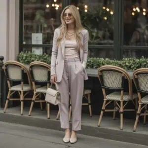 Elevate your style effortlessly by pairing a basic white tee with a linen blazer and tailored trousers. This combination strikes a perfect balance between smart and casual, allowing the simplicity of the tee to shine through. The linen blazer introduces a breathable, textured layer that provides sophistication, while the tailored trousers create a polished silhouette that elongates the legs. This ensemble exudes an air of effortless chic, perfect for transitioning from an afternoon meeting to an evening out. Oversized sunglasses and a structured handbag enhance the look, making it versatile for various occasions.