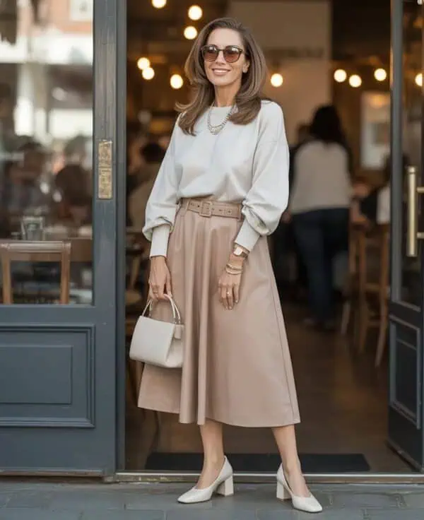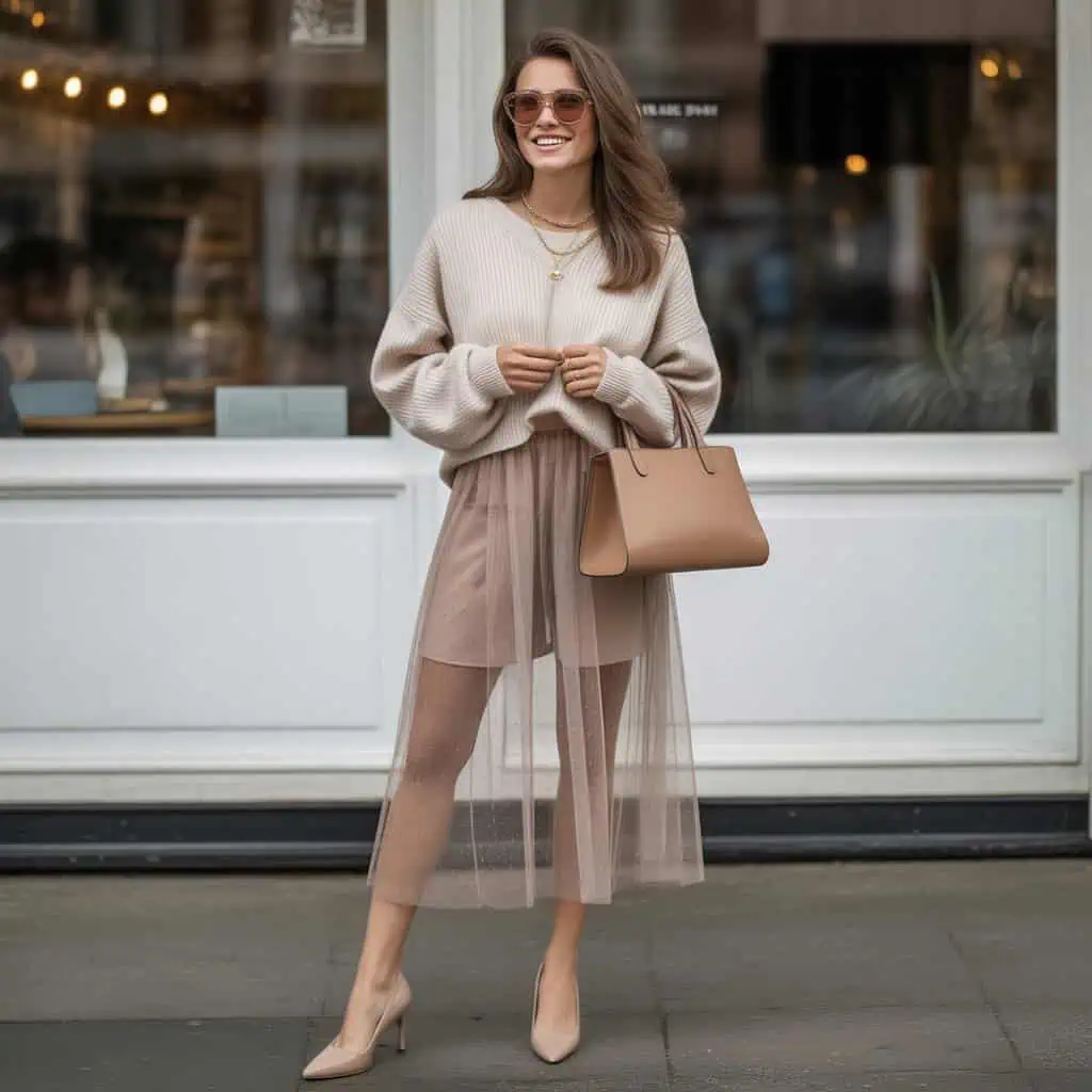 The sheer layered midi skirt is the embodiment of effortless elegance, allowing movement and airiness that feels just right for spring. When paired with a cozy oversized knit, this outfit strikes the perfect balance between refined and relaxed. The tucked-in front of the sweater defines the waist, accentuating your silhouette while maintaining comfort. The soft beige hue of the skirt complements the cream knit, creating a seamless flow that’s both chic and approachable. Accessories like brown sunglasses and subtle gold jewelry tie the look together, making it ideal for coffee dates or weekend brunches where you want to impress without trying too hard.