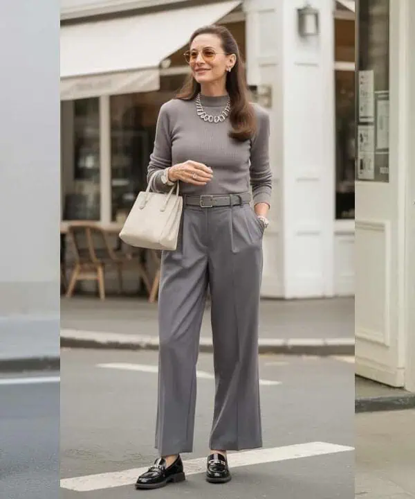 Combining a soft jersey boatneck top with flowy linen wide-leg pants results in an effortlessly chic ensemble that celebrates both comfort and style. The relaxed fit of the pants exudes ease, perfect for both lounging at home or enjoying a casual outing. By tucking the top into the pants and adding a belt, you create a defined waistline that flatters your silhouette while maintaining a laid-back feel. The boatneck neckline frames the face beautifully, highlighting your features. Beige heels add a touch of elegance without sacrificing comfort, while a structured leather handbag and minimal jewelry keep the look polished and sophisticated, showcasing that comfort doesn’t have to be boring.