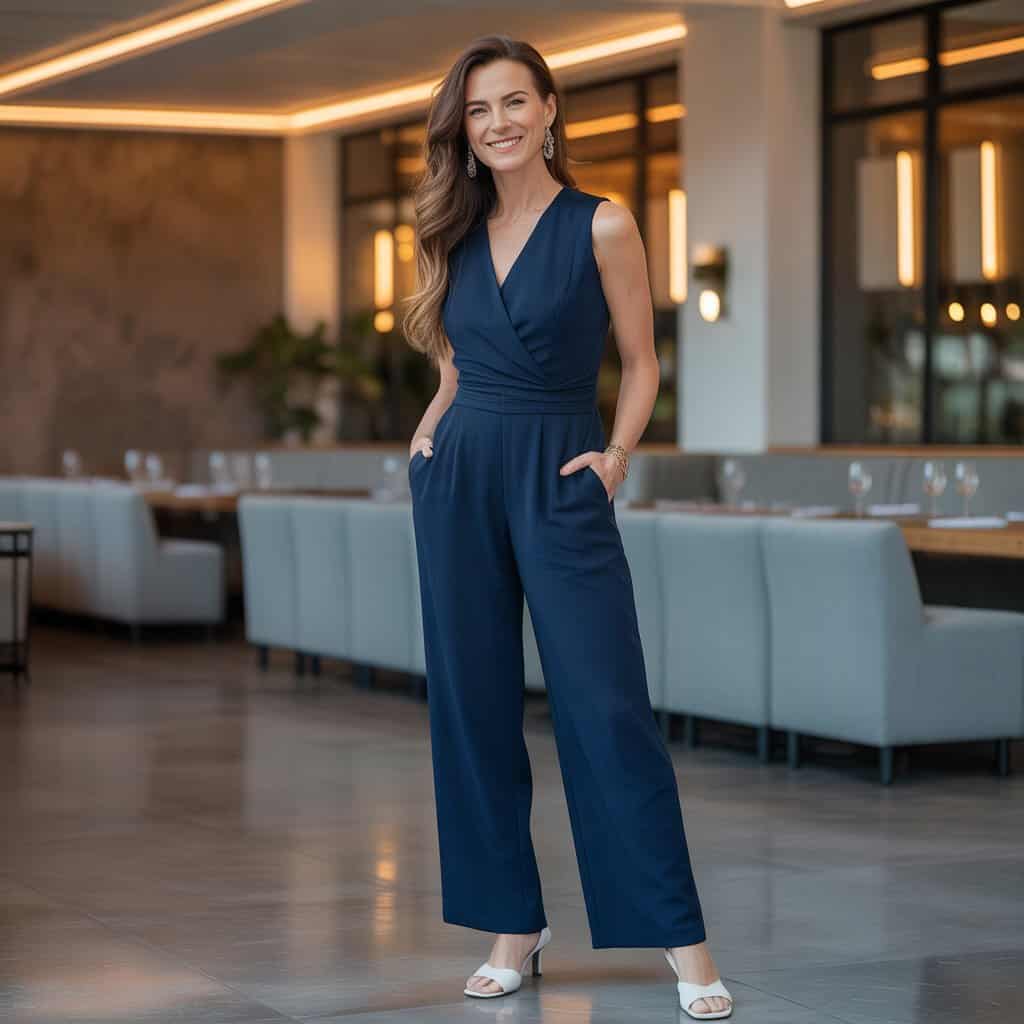 Nothing says modern sophistication quite like a sleeveless jumpsuit, particularly in a sleek navy tone. This outfit is perfect for those who want to feel put-together without excessive effort. The cinched waist emphasizes your figure while allowing for a comfortable fit that moves with you. Adding statement earrings injects personality into this chic look, making it suitable for both casual coffee catch-ups and evening dinners. The playful drop earrings draw attention upwards to your face, ensuring you radiate confidence and style, whether you’re chatting with friends or mingling at a gathering.