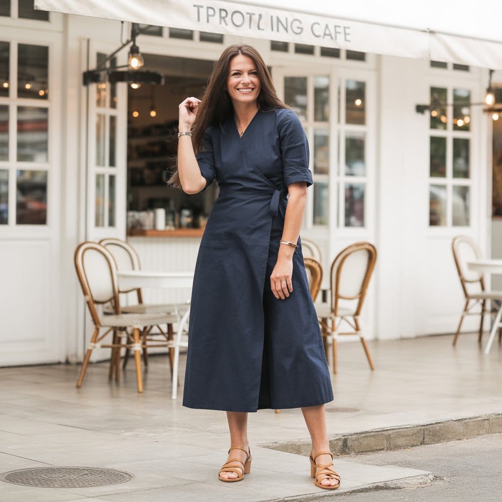 A cotton wrap dress is akin to a warm hug—easygoing yet stylish, it captures the essence of comfort while maintaining a certain flair. The classic navy shade is timeless, ensuring you look polished from day to night. This dress shape gently hugs your curves while being forgiving and breathable, making it ideal for various summer occasions. Complementing it with strappy tan sandals not only keeps the look light and airy but also elongates your legs, adding an effortless chic vibe. This combination strikes the perfect balance between ease and elegance, perfect for a leisurely day out or a dinner in style.