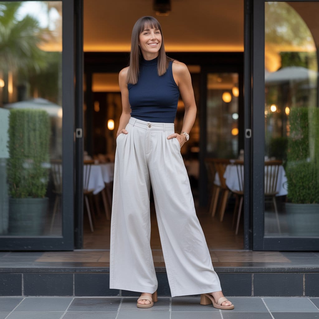 Embrace sophistication with a fitted sleeveless mock-neck top that elevates your silhouette and provides a sleek foundation for an ensemble. Tucking it into flowing wide-leg pants creates a beautiful contrast – the structured top highlights your figure while the pants add a breezy elegance. The addition of block-heel sandals brings a touch of height without sacrificing comfort, making this outfit versatile for both coffee dates and dinner plans. This look essentially encapsulates the idea of effortless chic, ideal for the woman who wants to exude confidence without overthinking her choices.