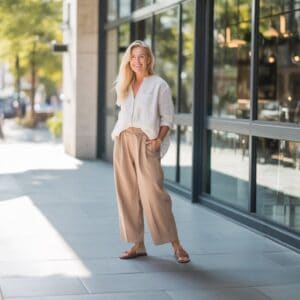Selecting a relaxed linen set elevates your wardrobe with effortless chicness, perfect for transitioning from a morning coffee break to an evening meal out. The breathable fabric allows for comfort, while maintaining a polished look that flatters various body types. By opting for wide-leg trousers, you gain a touch of sophistication, which pairs beautifully with the tailored fit of the linen top. Complementing the ensemble with raffia accessories adds texture and a hint of bohemian flair, while wedges provide the requisite height without sacrificing comfort. This ensemble strikes the ideal balance between laid-back elegance and trendy appeal, making it a must-have for your style repertoire.