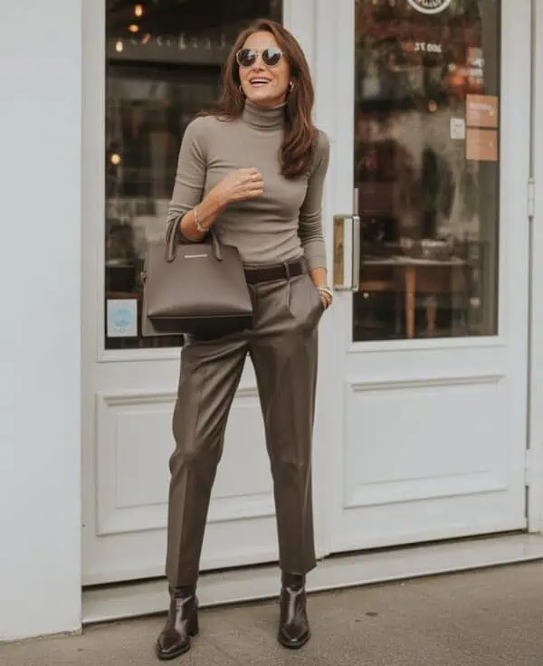 A fitted mock neck top paired with ponte pants is a fantastic choice that marries comfort with a sleek profile. The mock neck adds an air of sophistication and warmth, while its snug fit enhances the body’s shape beautifully. Ponte pants, known for their stretch and structure, create a polished silhouette that feels as good as it looks. This pairing is incredibly versatile, perfect for both casual meet-ups and semi-formal events. The choice of white sneakers adds a contemporary twist, keeping the outfit youthful and fresh, while still allowing for easy movement throughout the day.
