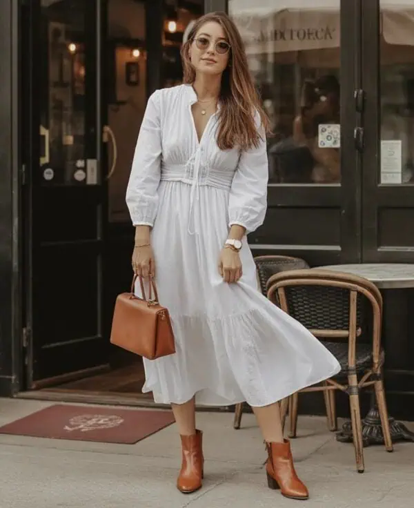 A flowy midi dress in a soft taupe hue embraces both comfort and femininity, making it a fantastic choice for the summer months. With its light and breezy fabric, this dress allows for easy movement while flattering your figure. The minimal detailing keeps it elegant and allows accessories to shine—a statement necklace or some stacked bracelets can provide personality. Nude strappy sandals tie in effortlessly, lengthening the look while keeping it easygoing. This outfit exudes a relaxed yet put-together vibe, perfect for garden parties or casual gatherings, making it a guaranteed compliment magnet.