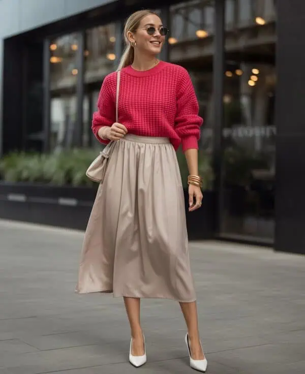 Let’s start with a bang – a bright-colored turtleneck sweater paired with ivory pants is a combo that radiates joy and sophistication. The bright turtleneck draws focus to your face, giving you that youthful glow, while the ivory pants bring an air of neat, refined elegance.