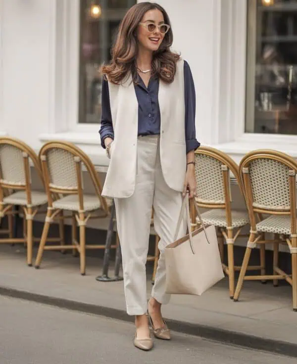 The white short-sleeve top, a versatile staple, effortlessly transitions from casual to chic. The black linen pants offer breathability and comfort, and the black’s slimming effect instills confidence, ensuring you feel both poised and stylish.