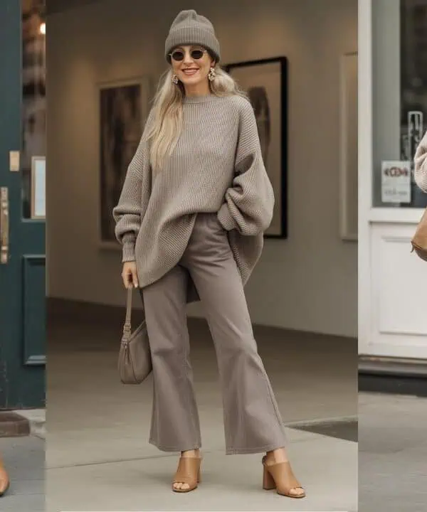 Nothing says cozy and sophisticated quite like a cashmere knit set. This soft beige ensemble is perfect for layering, offering warmth without the bulkiness that many outfits can carry. The relaxed sweater paired with matching pants strikes a perfect balance between comfort and elegance, making it your go-to for laid-back days. Slip-on loafers further enhance ease, allowing you to navigate your day effortlessly. Whether you’re enjoying a leisurely morning at a café or exploring local shops, this outfit envelops you in luxury while keeping your style on point.
