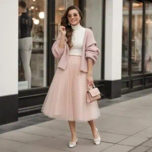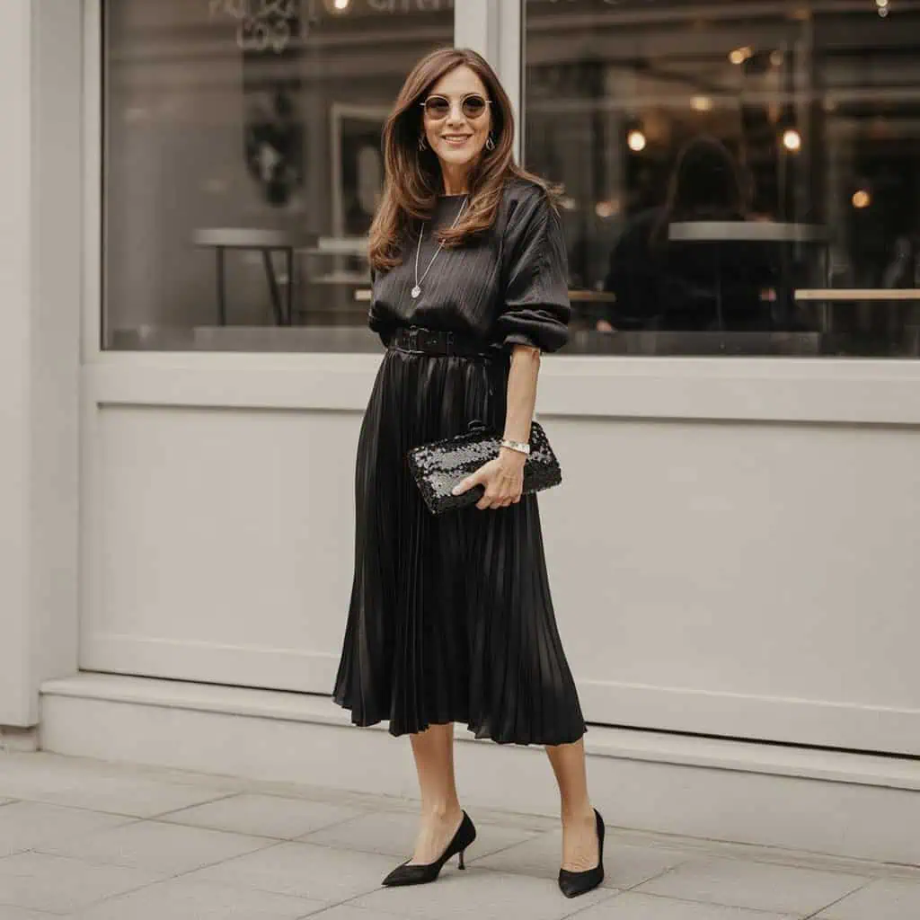 Opting for a pleated midi dress is a delightful way to marry elegance with ease during the holiday season. The charcoal shade provides a versatile canvas that’s effortlessly chic, while the pleats add movement and texture. The belted waist enhances your figure, creating an hourglass silhouette that flatters any body type. Heels bring a modern edge and subtle height, perfect for standing out at holiday gatherings. Accessories like round sunglasses and a delicate silver necklace impart a fresh, youthful vibe, ensuring you’re both confident and stylish while mingling with friends.