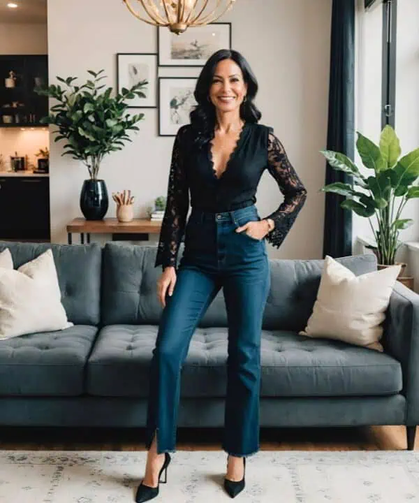 Quality jeans are essential for every woman’s winter wardrobe, especially when they’re styled to perfection. A straight-leg design offers timeless appeal, creating a streamlined look that suits many body types. Pairing them with a simple white tee strikes the right balance between casual and polished, while a long, shapeless cardigan offers comfort and a cozy layer against the chill. Neutral low block heels add a touch of sophistication without sacrificing comfort, making them perfect for daily wear. Accessories like hoop earrings and oversized sunglasses enhance this look, bringing a touch of glam that’s ideal for coffee dates or casual weekend outings.