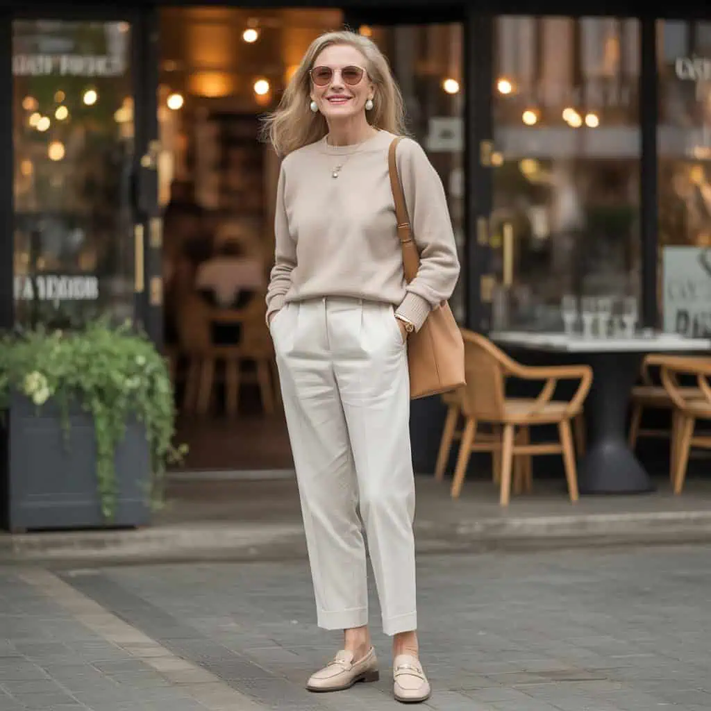 A neutral turtleneck is a staple every woman over 60 deserves in her wardrobe. Its versatility allows for seamless layering, making it perfect for both casual and polished looks. This timeless piece provides a soft, flattering frame around the face, enhancing natural beauty while providing warmth without the bulk. Pairing it with well-fitted trousers creates a sophisticated silhouette that elongates the legs and offers a chic balance. Accessories like pearl earrings and stylish sunglasses effortlessly elevate the outfit, adding a touch of elegance without overwhelming the simplicity of the turtleneck. This ensemble proves that classic pieces can be both comfortable and fashionable, ensuring you stay cozy and stylish throughout the winter.