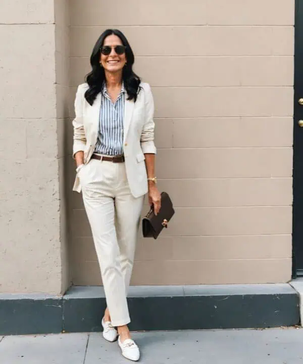 Opting for a linen blend blazer with matching pants speaks volumes about style and comfort, especially for the 50-plus crowd. Linen is a breathable fabric, perfect for warmer weather while still maintaining a structured look. The tailored blazer accentuates the shoulders and traditional lines, giving it a sharp sophistication, while straight pants provide an easy fit that allows for movement. Cinching at the waist enhances your natural shape without compromising on comfort, creating a cohesive ensemble. Complementing the look with elegant pumps adds height and poise. When paired with a simple tote and sleek accessories, this outfit effortlessly transitions from day to evening engagements.