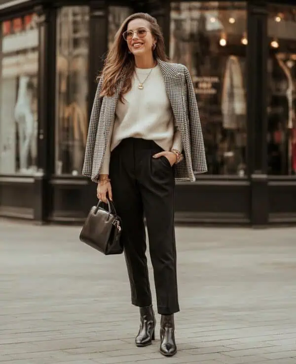 There’s nothing more refined than a tweed ensemble that whispers sophistication; the texture adds depth to any outfit, making it ideal for layering. Its structured fit sharpens your look, emphasizing your waist and elongating your figure.