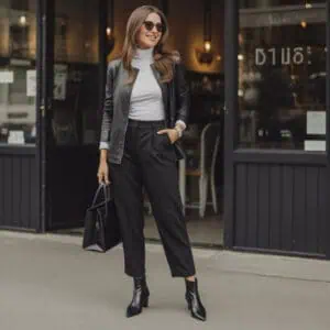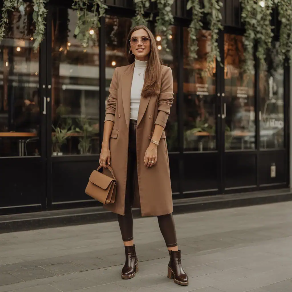 Longline blazers are the ultimate style statement when it comes to pairing with leggings. Their tailored fit not only adds structure to your outfit but also transforms a simple legging look into a sophisticated ensemble. A fitted ivory turtleneck underneath adds warmth and additional layering without bulk. The dark brown leather ankle boots with a stacked heel introduce a polished element while maintaining comfort, perfect for a day on the go. Accessorizing with a tan structured bag and minimalist gold jewelry brings cohesion to the color palette, making this outfit ideal for transitioning from meetings to social engagements with ease.