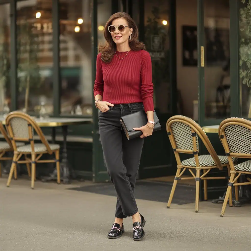 When seeking that perfect blend of comfort and style, a cashmere sweater paired with straight jeans becomes a go-to choice for effortless elegance. The luxurious feel of cashmere elevates the everyday sweater to something special, offering warmth without sacrificing sophistication. Straight-leg jeans maintain a flattering silhouette that’s both modern and timeless, providing the ideal balance beneath this cozy top. Loafers add a polished touch while ensuring comfort—perfect for a day out or casual meet-ups. Finish the look with minimal gold jewelry and oversized sunglasses for an understated yet stylish statement that’s perfect for the woman who values comfort without compromising on chicness.