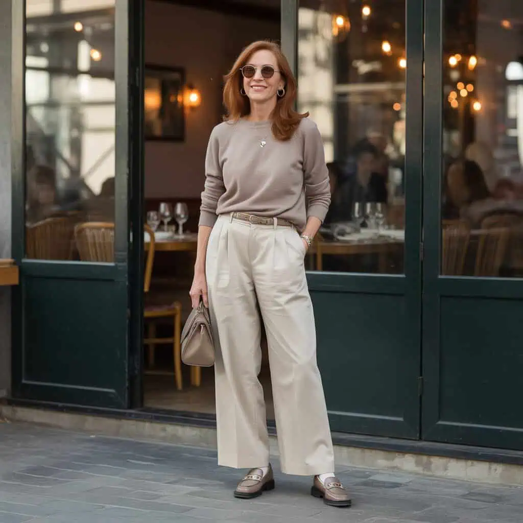 Imagine the effortless sophistication of a cashmere sweater elegantly tucked into plush wide-leg trousers. This pairing exudes both comfort and style—perfect for a dinner outing. The soft taupe color of the cashmere beautifully complements the creamy shades of the trousers, providing a modern yet classic palette. The wide-leg silhouette adds a lengthening effect, while the belted waist helps define the figure. Pair it with stacked-heel loafers to add a bit of height without sacrificing comfort. The bag and round sunglasses complete this look, demonstrating that practicality and high fashion can coexist chicly even in fall.