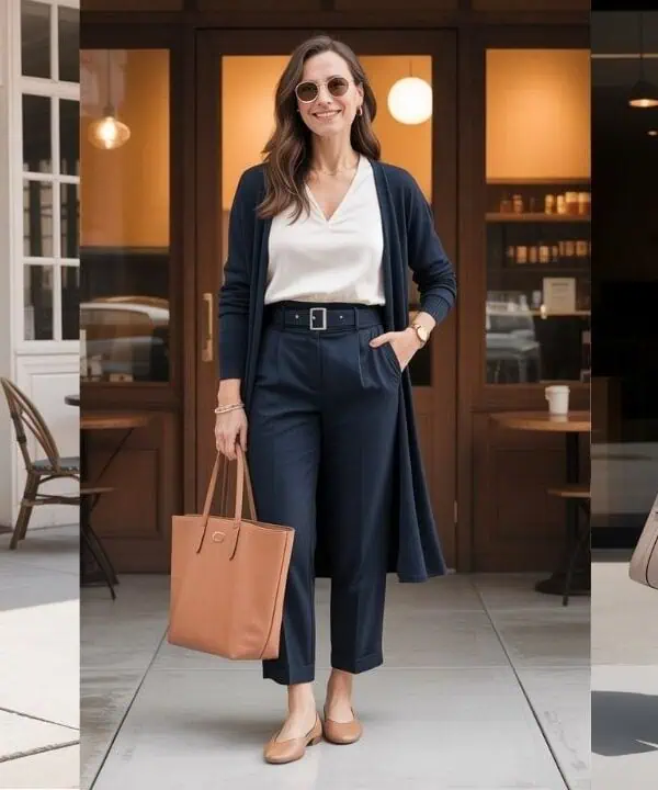 Think outfits like a flowy dress with a cardigan, casual slacks with a cute top and blazer, even nice jeans with a fun blouse and pumps.