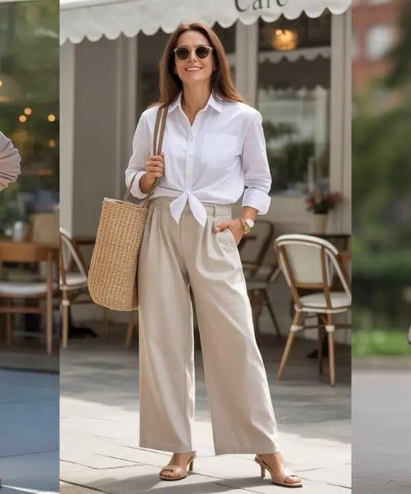 Navy linen pants are a versatile piece that exudes polished comfort, making them ideal for an outdoor summer gathering. Paired with a classic striped tee, this outfit strikes the perfect balance between casual and refined. The blazer elevates the look, adding a tailored touch that invites a bit of sophistication without being overly formal. The chic trendy mules not only offer comfort for all-day wear but also complete the chic urban flair. Together, this outfit transitions effortlessly from day to evening, making it a stylish choice for any summer event where style and ease take center stage.