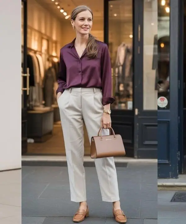A neutral wrap blouse is the kind of wardrobe partner that elevates wide-leg jeans from casual to utterly sophisticated. The cinched waist of the blouse highlights your natural curves, offering a flattering contrast to the jeans’ loose fit.
