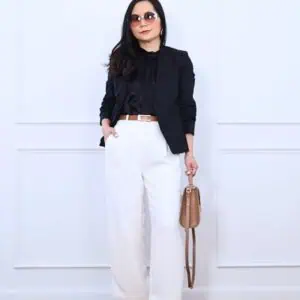Another hero piece in my closet: black palazzo pants. They instantly dress up even the simplest tops. I paired them with a black sleeveless button-up blouse, which I cinched at the waist for definition. The monochrome palette keeps things sleek and elegant.