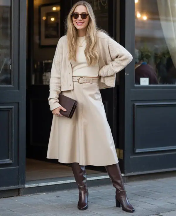 Pairing a v-neck blazer with a pleated skirt brings a decent level of modernity to your wardrobe. The blazer is flattering for your upper body. Overall, the pleated skirt adds feminine flair.