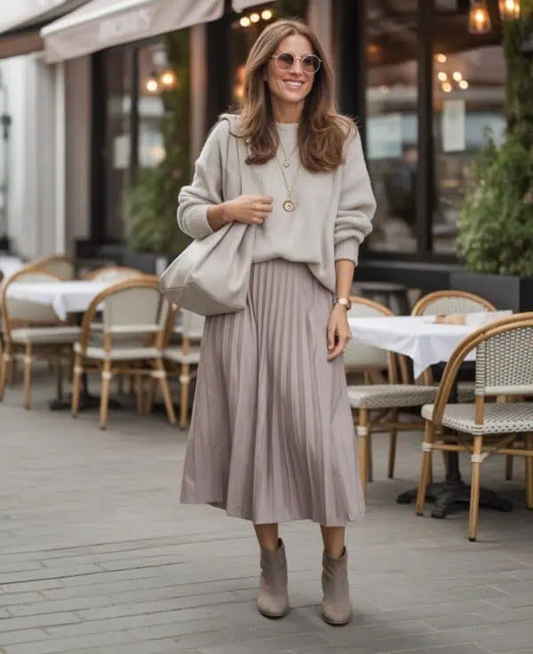 Opting for a crisp button-up paired with a pleated midi skirt encapsulates a blend of classic and contemporary style. The button-up, when tucked in, adds structure while emphasizing your waist, and the flowy skirt creates a graceful silhouette that moves beautifully. Heeled mules elevate the outfit without sacrificing comfort, allowing for easy transitions from day to night. The quilted crossbody adds a touch of sophistication, while oversized sunglasses exude confidence. This look strikes the perfect balance between polished and playful, ensuring you step out feeling both bold and effortlessly chic.